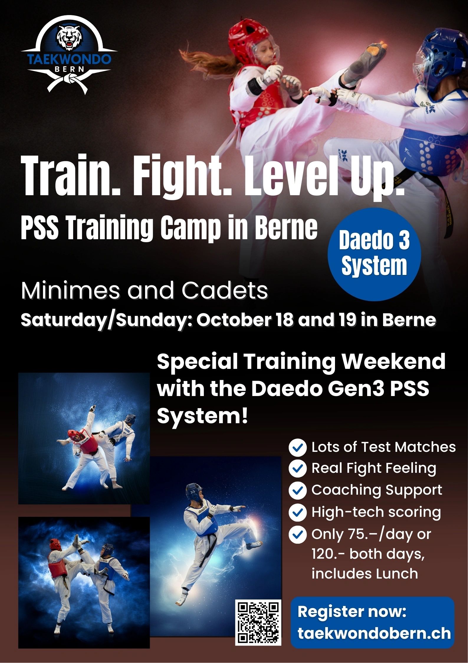 Level up! Dieses Wochenende ist für Minimes und Kadetten, die mit dem Daedo 3 PSS-System trainieren. Zielen, punkten, jeden Treffer zählen lassen – mit schnellen Drills, smarten Taktiken und echtem Wettkampf-Feeling. Platz ist limitiert - melde Dich jetzt an!
